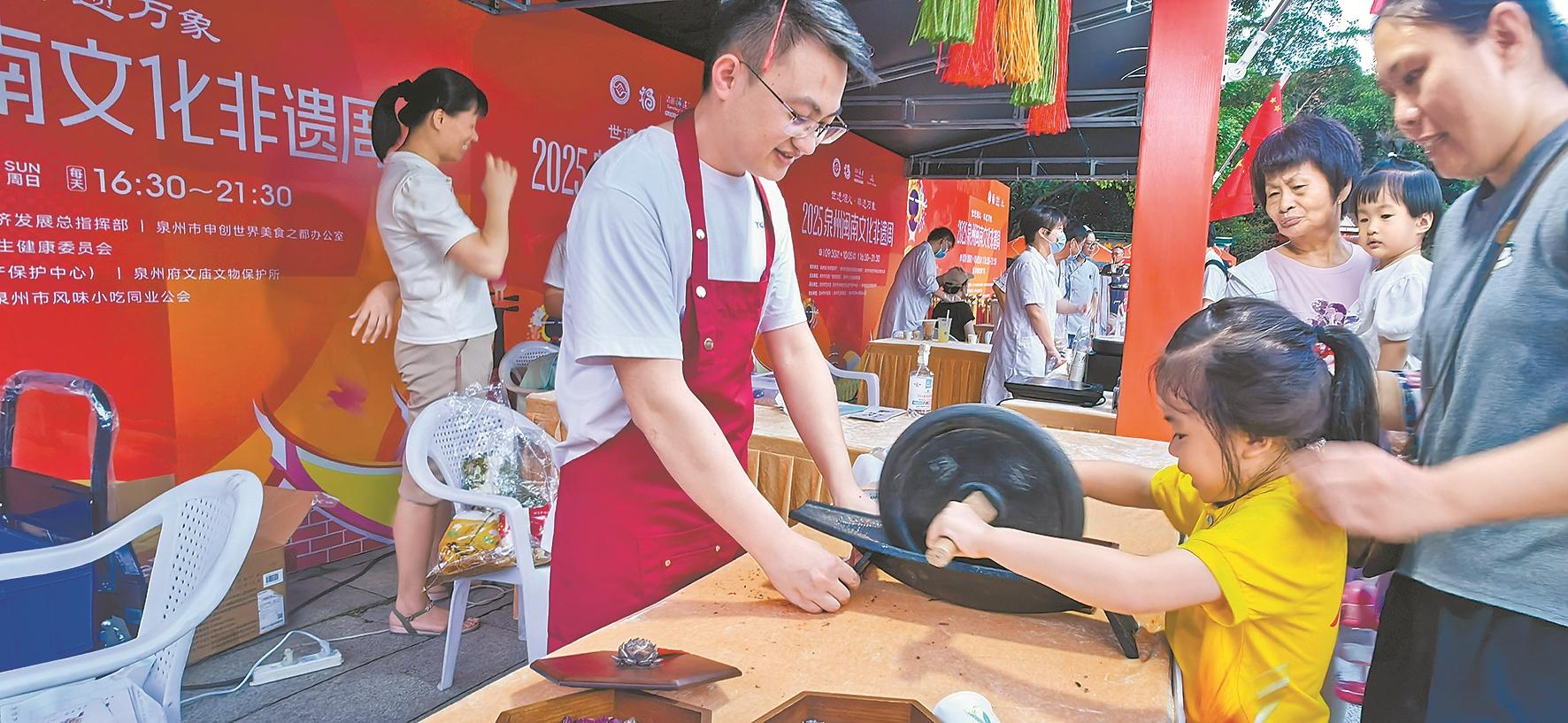 2025年泉州国庆闽南文化非遗周系列活动中,小朋友体验中药炮制。