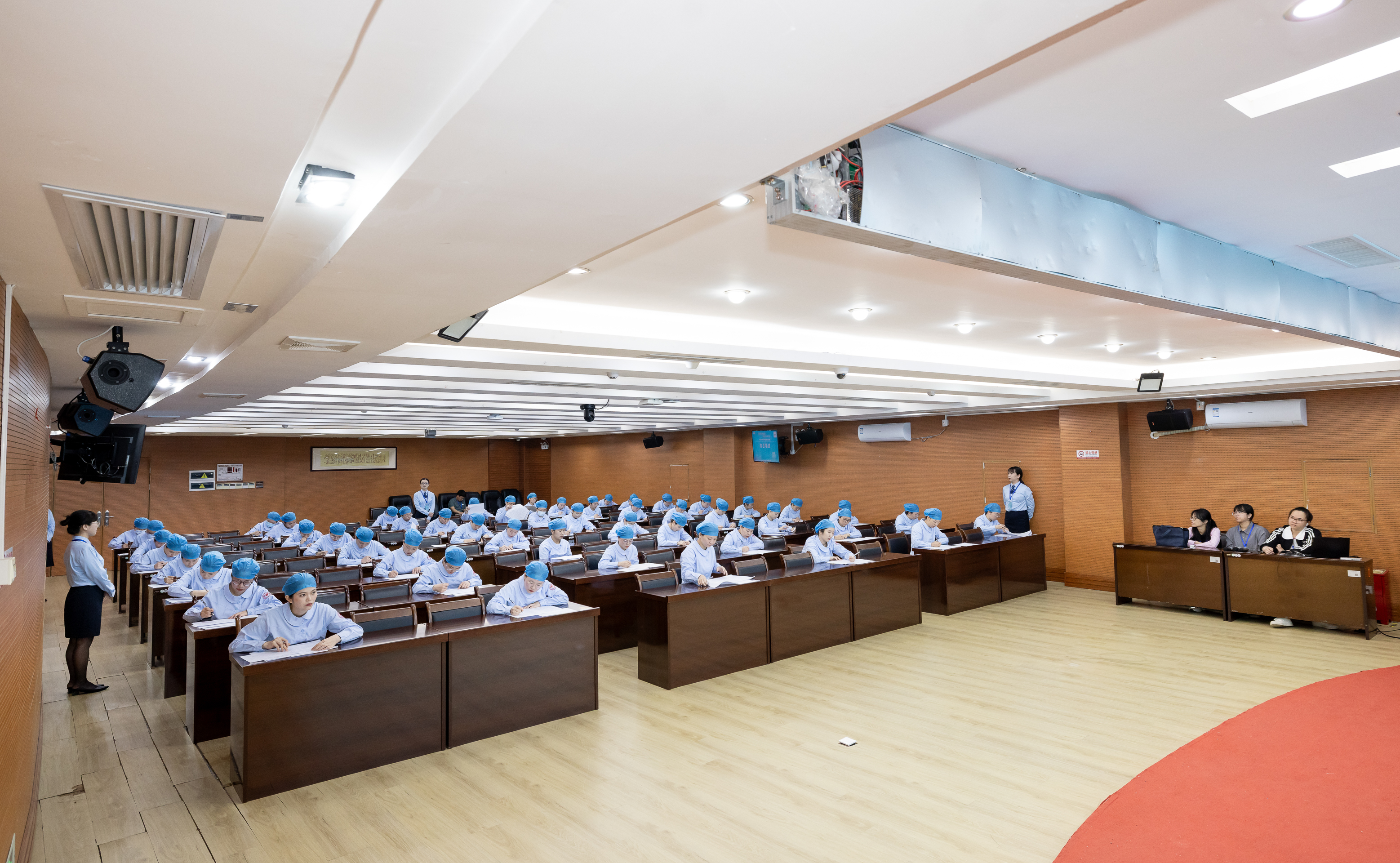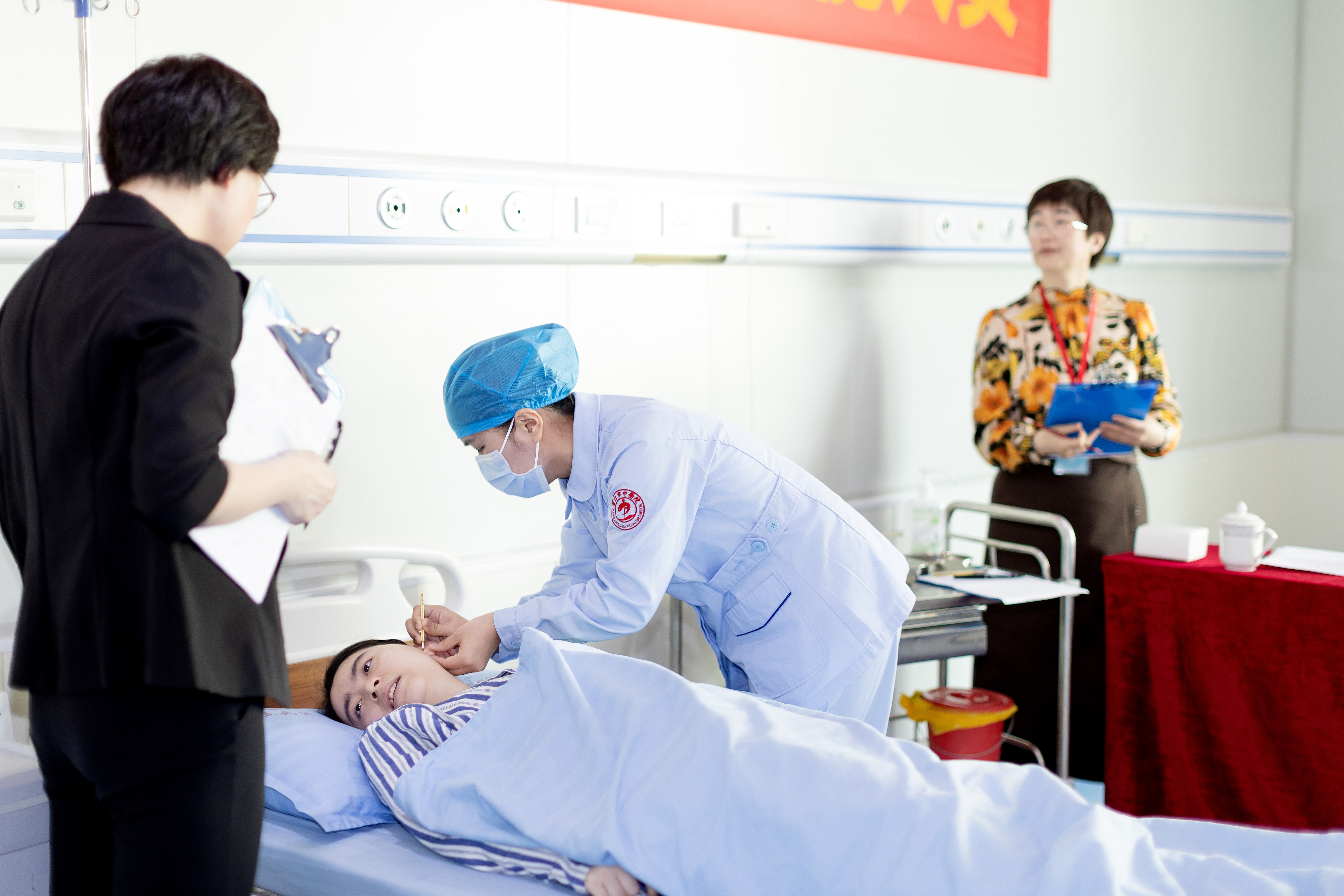 大赛设置综合笔试与现场技能演示两个环节,技能演示同步开展个人与团队竞赛。个人赛以耳穴贴压技术为考核内容,重点检验操作规范、理论基础与人文关怀落实情况;团队赛围绕胃脘痛病例开展辨证施护,涵盖病史采集、中医辨证、护理操作、护理文书撰写等全流程,综合考核选手临床思维与团队协作水平。参赛选手沉着应对、操作规范,团队配合有序,展现了扎实的中医护理专业能力。